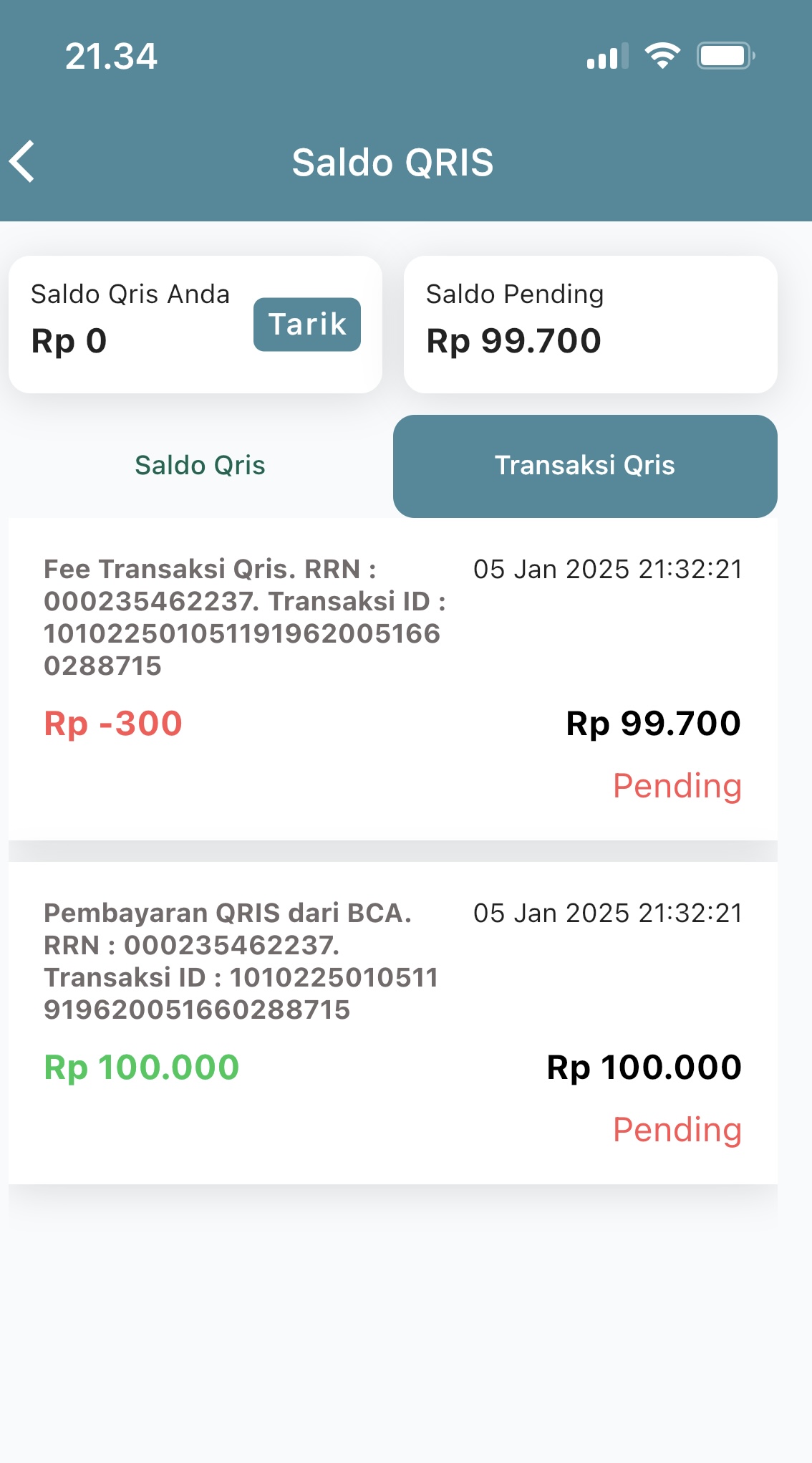 - Pada hari Senin, tanggal 06 Januari 2025, saldo pending sejumlah Rp 99.700 telah berpindah ke Saldo QRIS Anda, dan saldo sejumlah Rp 99.700 sudah dapat di tarik dan dipindahkan ke Saldo Pulsabayar